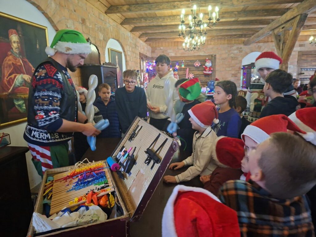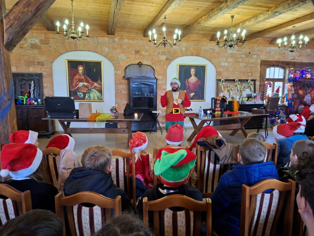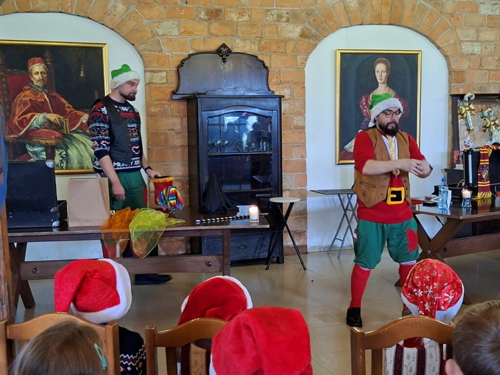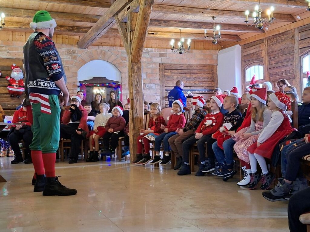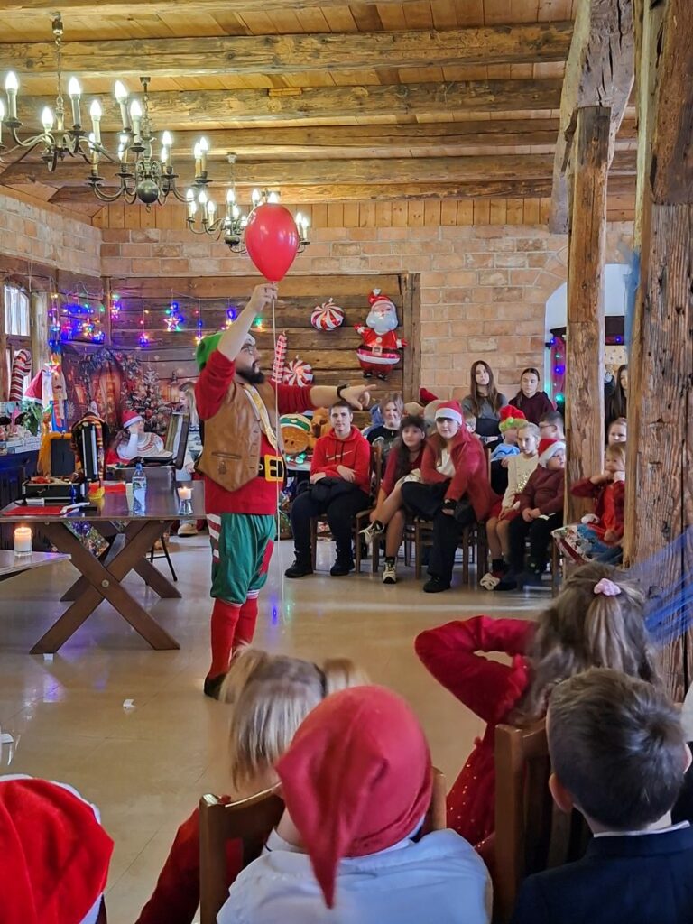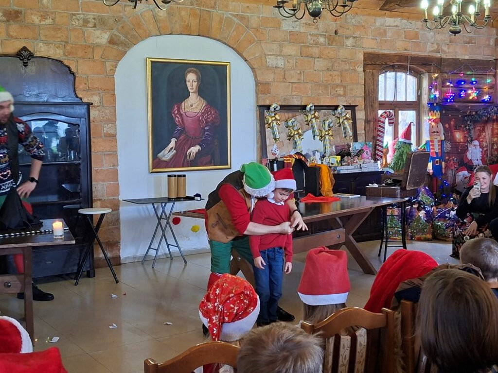 Zanim jednak Mikołaj dotarł na miejsce, w Grodzie Rycerskim pojawiła się dwójka jego pracowitych pomocników. Para elfów zabawiała dzieci pokazem magii, w trakcie którego kolorowanki same się kolorowały, barwne kulki w tajemniczy sposób się mnożyły, a spod świątecznych czapek wyłaniały się nagle magiczne różdżki. Dzieci brały oczywiście w zabawie czynny udział i pomagały w realizacji wielu tych sztuczek. Nie tylko one z resztą – do pomocy został zwerbowany również burmistrz Lubomierza, Mariusz Warowy. Śmiechom, brawom i zachwytom nie było końca, a swobodna atmosfera sprawiła, że nikt nie wstydził się głośno i bez zahamowań wyrażać pozytywnych emocji.
