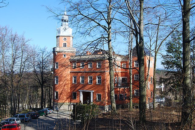 A historia obiektu zaczyna się w połowie XIX w., gdy budowę rezydencji w stylu zamkowo-dworskim, na specjalnie uformowanej skarpie. rozpoczął jeleniogórski przemysłowiec w branży włókienniczej Richard von Kramst. Pod koniec XIX w. obiekt nabył Oscar Caro, bogaty przemysłowiec ze Śląska, który przebudował i zmodernizował pałac (projektantem był jeden z najlepszych wrocławskich architektów – Karl Grosser) w stylu eklektycznym. Po śmierci Oscara Caro obiekt został zakupiony przez Niemiecki Front Pracy, który przebudował go na centrum szkoleniowe NSDAP.