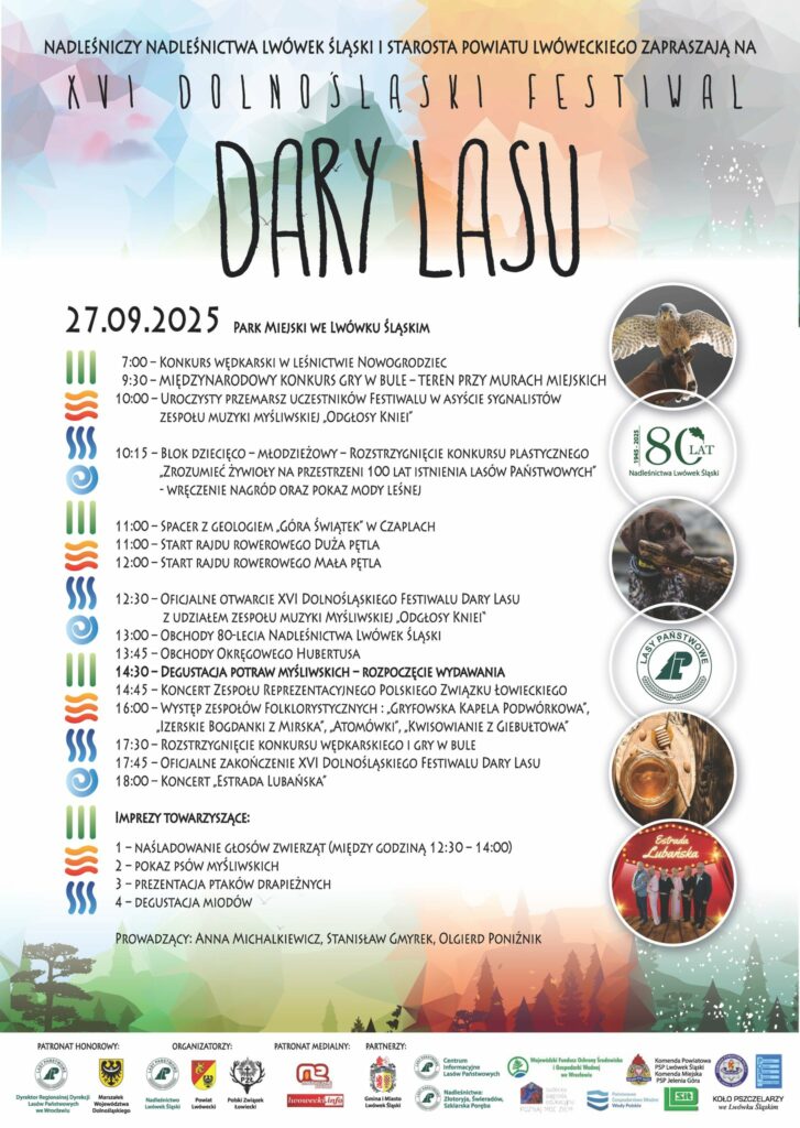 Już w sobotę, 27 września 2025 roku, zapraszamy do Parku Miejskiego w Lwówku Śląskim na XVI Dolnośląski Festiwal „Dary Lasu”. To doskonała okazja, by odkryć bogactwo dolnośląskich lasów, spróbować regionalnych przysmaków, posłuchać muzyki myśliwskiej i folkowej oraz spędzić czas w rodzinnej atmosferze. Tegoroczna edycja wydarzenia odbywa się pod hasłem „Żywioły” i będzie wyjątkową okazją, by wspólnie odkrywać potęgę ziemi, wody, powietrza i ognia. W tym roku festiwal nabiera szczególnego znaczeni, jest bowiem częścią obchodów 80-lecia Nadleśnictwa Lwówek Śląski, zasadniczą część wydarzenia stanowić będzie także Okręgowy Hubertus, czyli święto Polskiego Związku Łowieckiego!