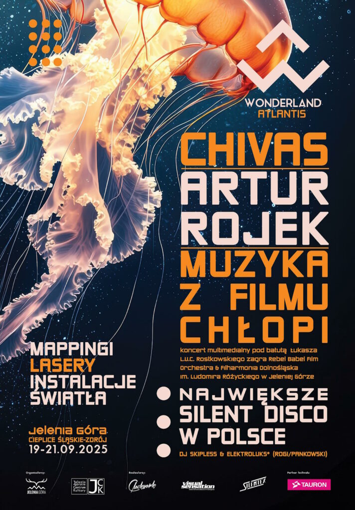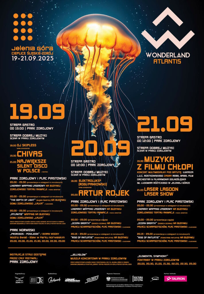 Zanurz się w światło, które opowiada historie. Festiwal Światła WONDERLAND 2025 – ATLANTIS to najbardziej spektakularne wydarzenie artystyczne Jeleniej Góry – niezwykła podróż do mitycznej krainy światła i wyobraźni, w której serce Cieplic przemieni się w tętniące emocjami podwodne imperium. Na trzy magiczne dni miasto rozbłyśnie tysiącem świateł, muzyką na najwyższym poziomie i pulsującą energią wspólnego przeżywania sztuki. Na wydarzenia wstęp wolny.