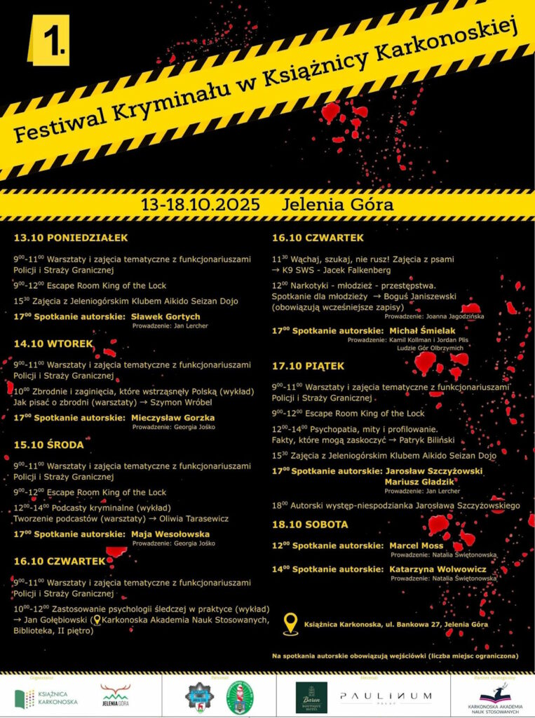 Dla miłośników literackiego kryminału, jak również fanów zagadek detektywistycznych, zbrodni, które wstrząsają, zainteresowanych pracą kryminologów, policyjnych techników i profilerów jesień w jeleniogórskiej Książnicy Karkonoskiej zapowiada się wybornie. Od 13 do 18 października 2025 r. odbywać się w niej bowiem będzie pierwsza edycja Festiwalu Kryminalnego, obfitująca w najróżniejsze atrakcje tematyczne, z mnóstwem spotkań autorskich na czele. Szczególne wydarzenie będzie też miało w bibliotece Karkonoskiej Akademii Nauk Stosowanych w Jeleniej Górze. Chcecie poznać autorów kryminałów czy choćby tajniki pracy profilera policyjnego? To czas dla Was!