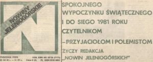 Drodzy Państwo, mamy dla Państwa podarek! Oto opowieść wigilijna z „Nowin Jeleniogórskich: tygodnika ilustrowanego”, z numeru 52/53., który ukazał się 44 lat temu, w wydaniu z 24 grudnia 1980 – 6 stycznia 1981 roku. Jego autor, Marian Kozłowski, traktując swój tekst-opowiastkę jako gwiazdkowy upominek dla Czytelników – uważał jej wydrukowanie za prezent Redakcji dla siebie. Niniejszym powracamy … Czytaj dalej Nowiny historyczne: Wigilia w barze mlecznym