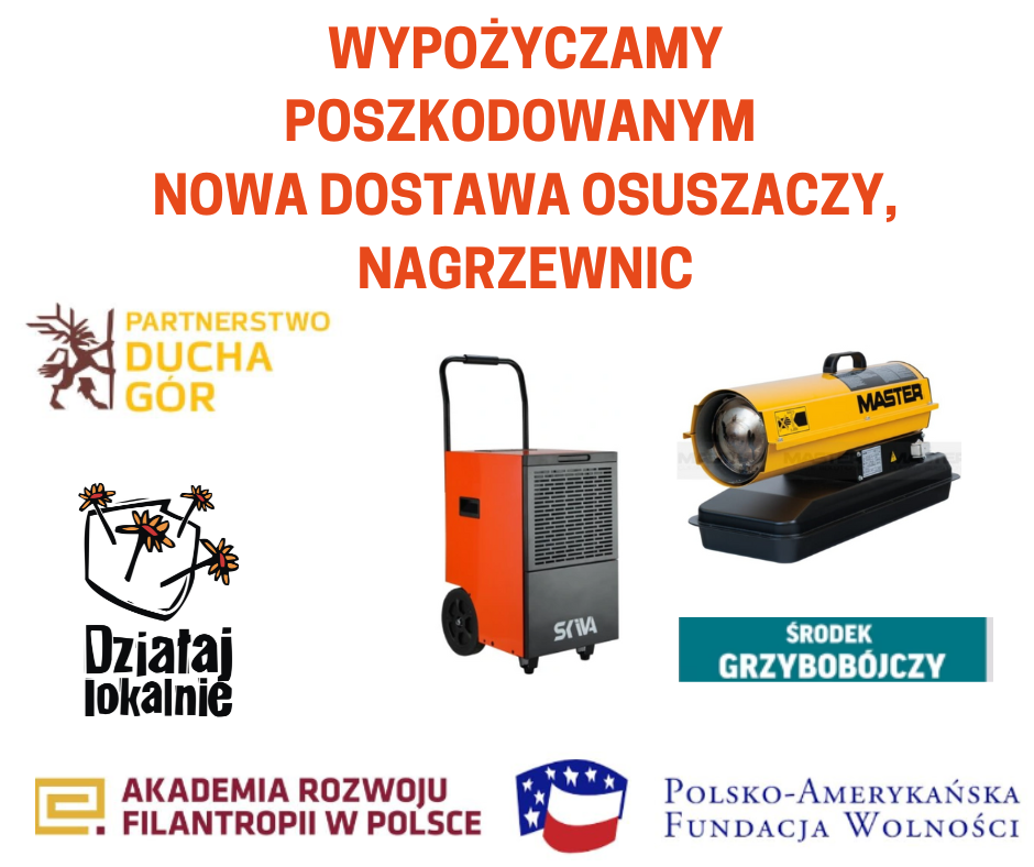 Stowarzyszenie Lokalna Grupa Działania „Partnerstwo Ducha Gór” w Kowarach zaprasza powodzian do bezpłatnego wypożyczenia osuszaczy, nagrzewnic, młotowiertarek i przekazania rękawic.