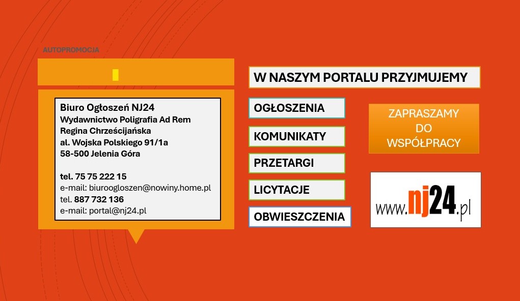Informujemy, że portal NJ24.pl przyjmuje do publikacji ogłoszenia, komunikaty, informacje o przetargach i licytacjach oraz obwieszczenia. Zapraszamy do współpracy!