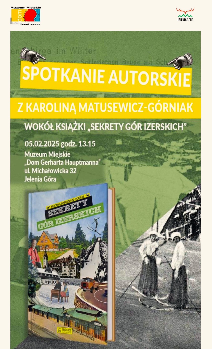 Już 5.02.2025, w środę, o godz.13.15, Muzeum Miejskie „Dom Gerharta Hauptmanna” w Jeleniej Górze – Jagniątkowie zaprasza na spotkanie autorskie z Karoliną Matusewicz-Górniak, autorką książki „Sekrety Gór Izerskich”. Objęliśmy patronat nad tą książką! Polecamy Państwa uwadze to spotkanie, gdyż książka wzbudziła, jak dotąd, duże zainteresowanie czytelników oraz sporo emocji wśród znawców tematu; to zatem szansa, by dowiedzieć się o niej jeszcze więcej, a także poznać szczegóły jej powstawania.