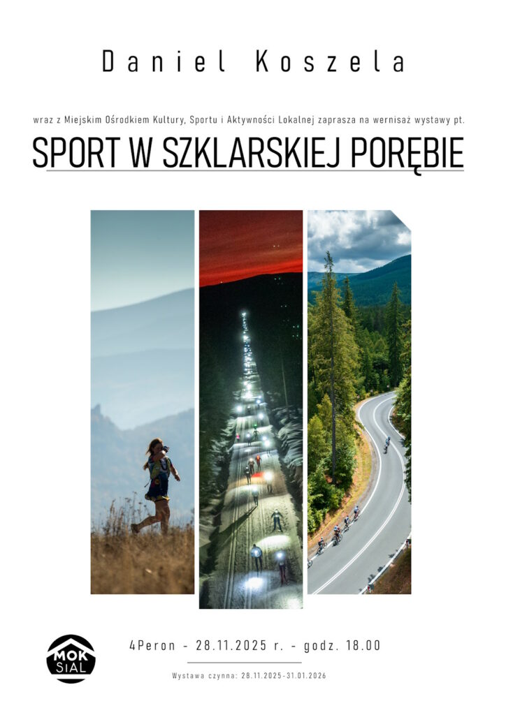 Miejski Ośrodek Kultury, Sportu i Aktywności Lokalnej w Szklarskiej Porębie zaprasza na wystawę fotografii Daniela Koszeli „Sport w Szklarskiej Porębie. Wyjątkowy wieczór ze sztuką i sportem, czyli wernisaż w piątek, 28 listopada 2025, o godz. 18.00 na 4 Peronie w Szklarskiej Porębie. Wstęp wolny. Wystawę oglądać będzie można do końca stycznia 2026 r.