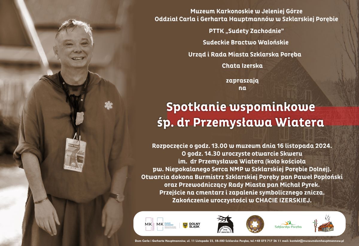 W dniu 16 listopada 2024, o godz. 13.00, Muzeum Karkonoskie w Jeleniej Górze (odział Carla i Gerharta Hauptmannów w Szklarskiej Porębie) wraz z PTTK „Sudetami Zachodnimi”, z Sudeckim Bractwem Walońskim, z Urzędem i Radą Miasta Szklarska Poręba oraz z Chatą Izerską zapraszają na spotkanie wspominkowe zmarłego cztery lata temu – dr Przemysława Wiatera.