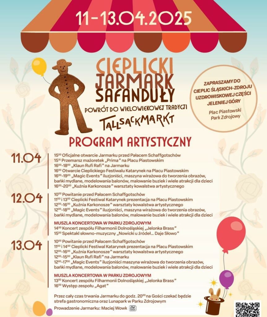 Na odwiedzających zatem czekać będą atrakcyjne wyroby regionalne, rękodzieło, wypieki, strefa gastronomiczna, atrakcje dla dzieci i dorosłych, lunapark, artyści uliczni, iluzjoniści, kataryniarze, występy artystyczne oraz CIEPLICKI SAFANDUŁA. Jarmark poprowadzi Maciej Wowk.