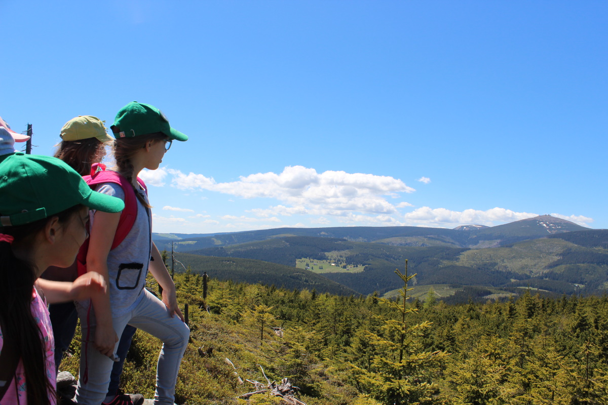 Kulminacyjnym wzniesieniem jest Łysocina połozona 1188 m n.p.m. ze Śnieżką w tle.