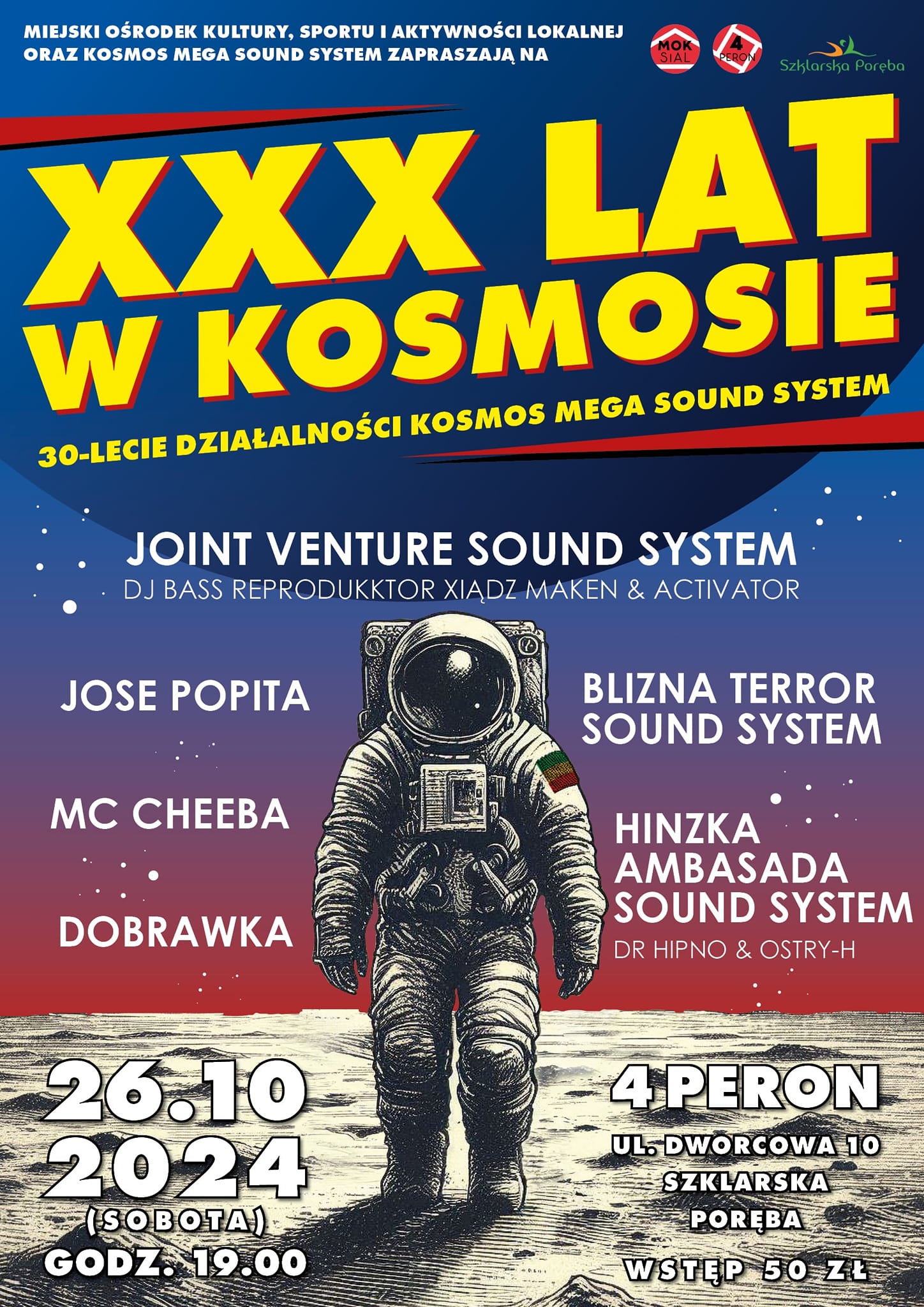 W sobotę 26 października 2024 o godz. 19.00 na 4 Peronie Miejskiego Ośrodka Kultury, Sportu i Aktywności Lokalnej w Szklarskiej Porębie, przy ul. Dworcowej 10, DJ Jasiek wraz ze legendarnymi soundami świętować będą 30-lecie działalności Kosmos Mega Sound System! Dla naszych Czytelników mamy bezpłatne wejściówki na to wyjątkowe wydarzenie! Zapraszamy i polecamy!