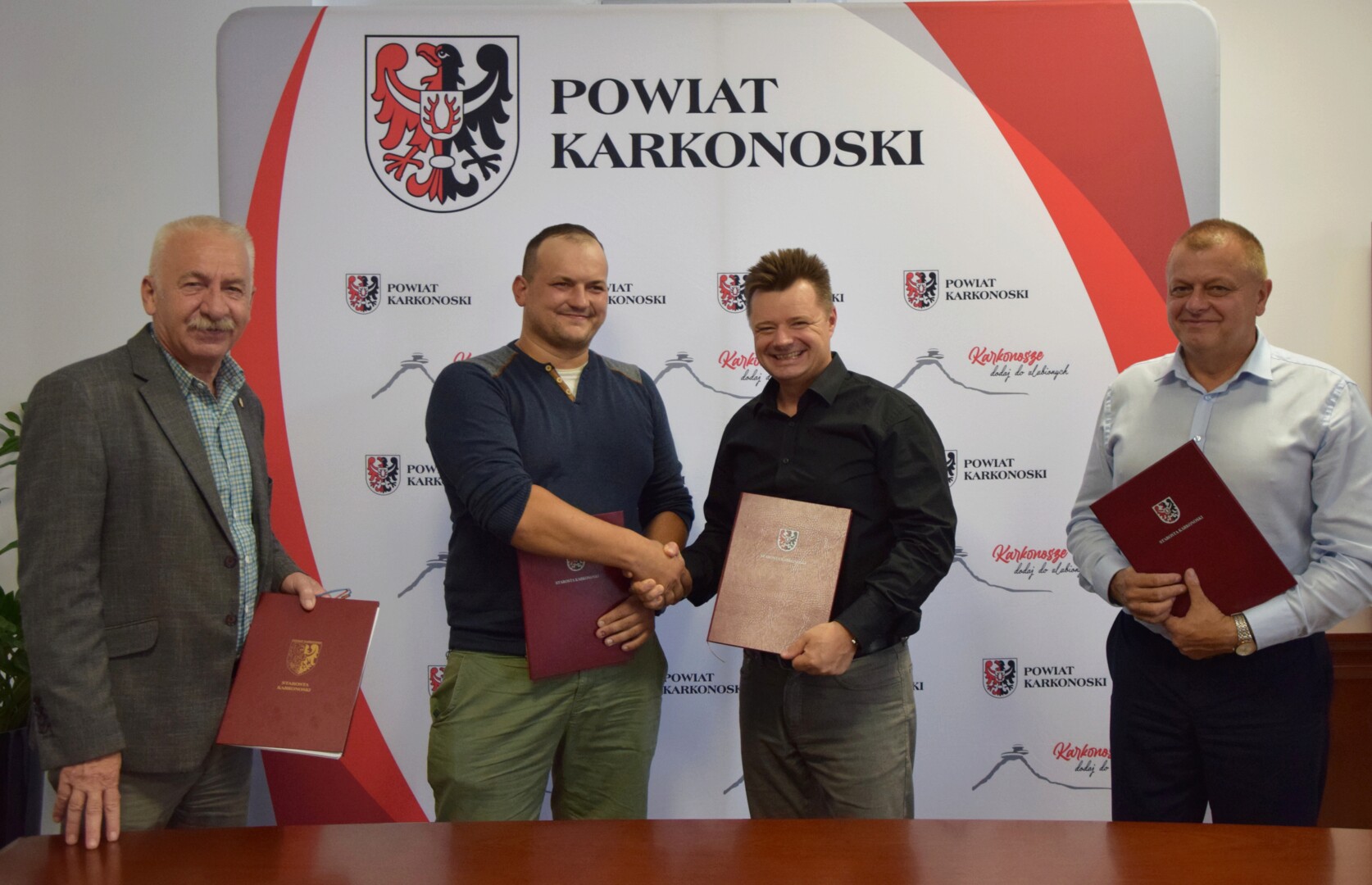 W podpisaniu umowy uczestniczyli: starosta karkonoski Krzysztof Wiśniewski, wicestarosta Mirosław Górecki i prezes zarządu BRW INSTALACJE sp. z o. o. Rafał Nosal.